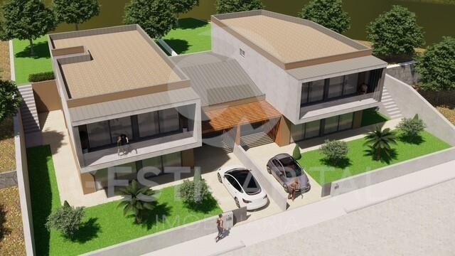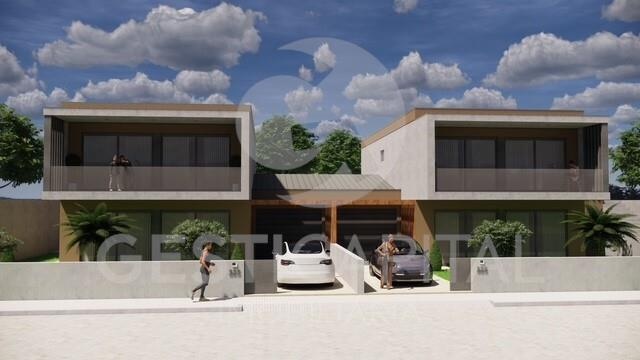 Implantada num lote de 400 m², esta moradia geminada pela garagem desenvolve-se em dois pisos e apresenta uma área bruta de construção de 249 m², com uma distribuição equilibrada e moderna.